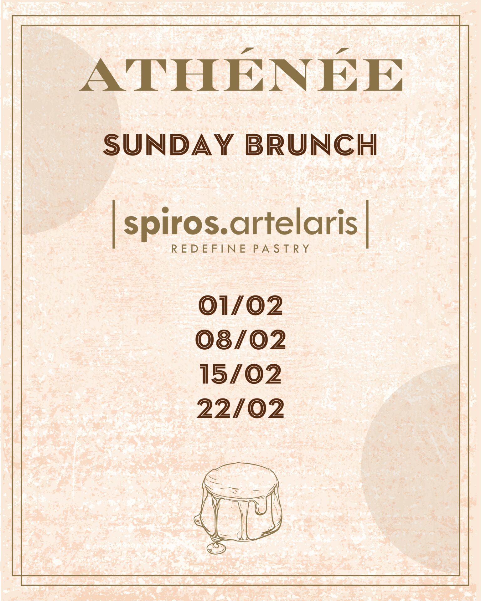 Το Sunday Brunch με τον Σπύρο Αρτελάρη θα πραγματοποιηθεί στις 01/02, 08/02, 15/02 και 22/02, προσκαλώντας όλους σε μια εμπειρία brunch που συνδυάζει διεθνείς επιρροές, σύγχρονη ζαχαροπλαστική και υψηλή αισθητική.
